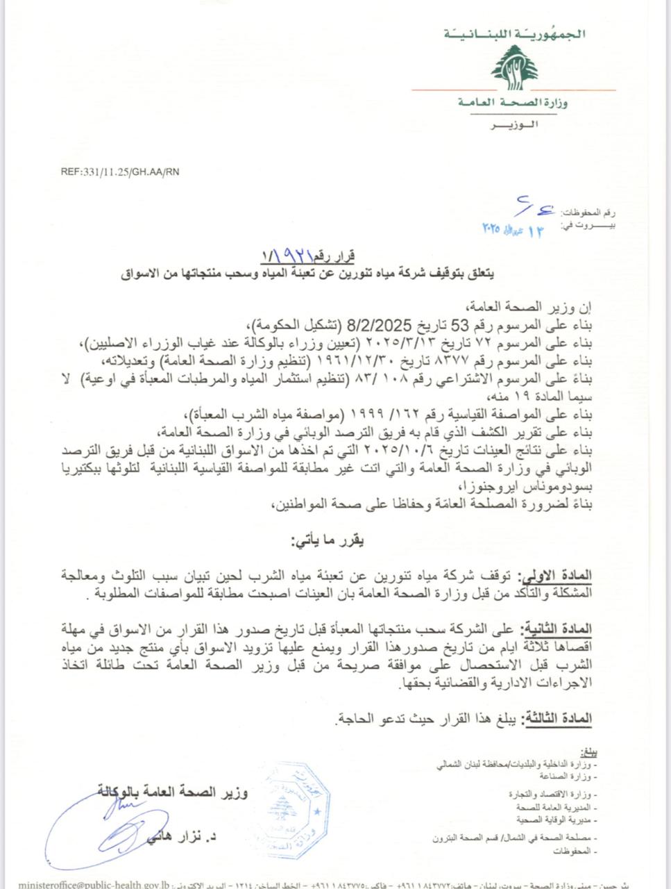 وزراة الصحة توقف شركة مياه تنورين بسبب التلوّث… ووقف المنتجات من السوق: