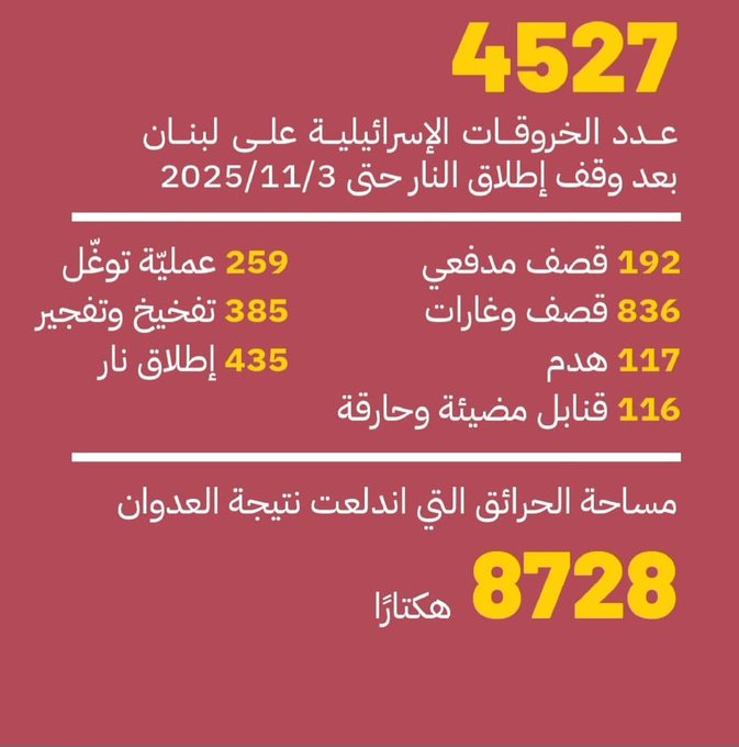 ( عدد الخروقات الاسرائيلية على لبنان منذ 27 نوفمبر 2024 وحتى 3 نوفمبر 2025)