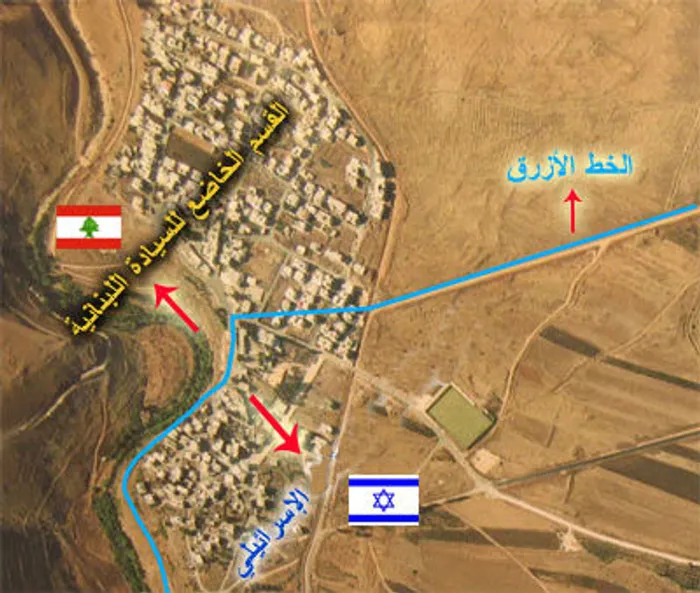 (الصورة تُظهر بلدة الغجر المقسّمة بين لبنان والأراضي المحتلّة بفعل الخط الأزرق)